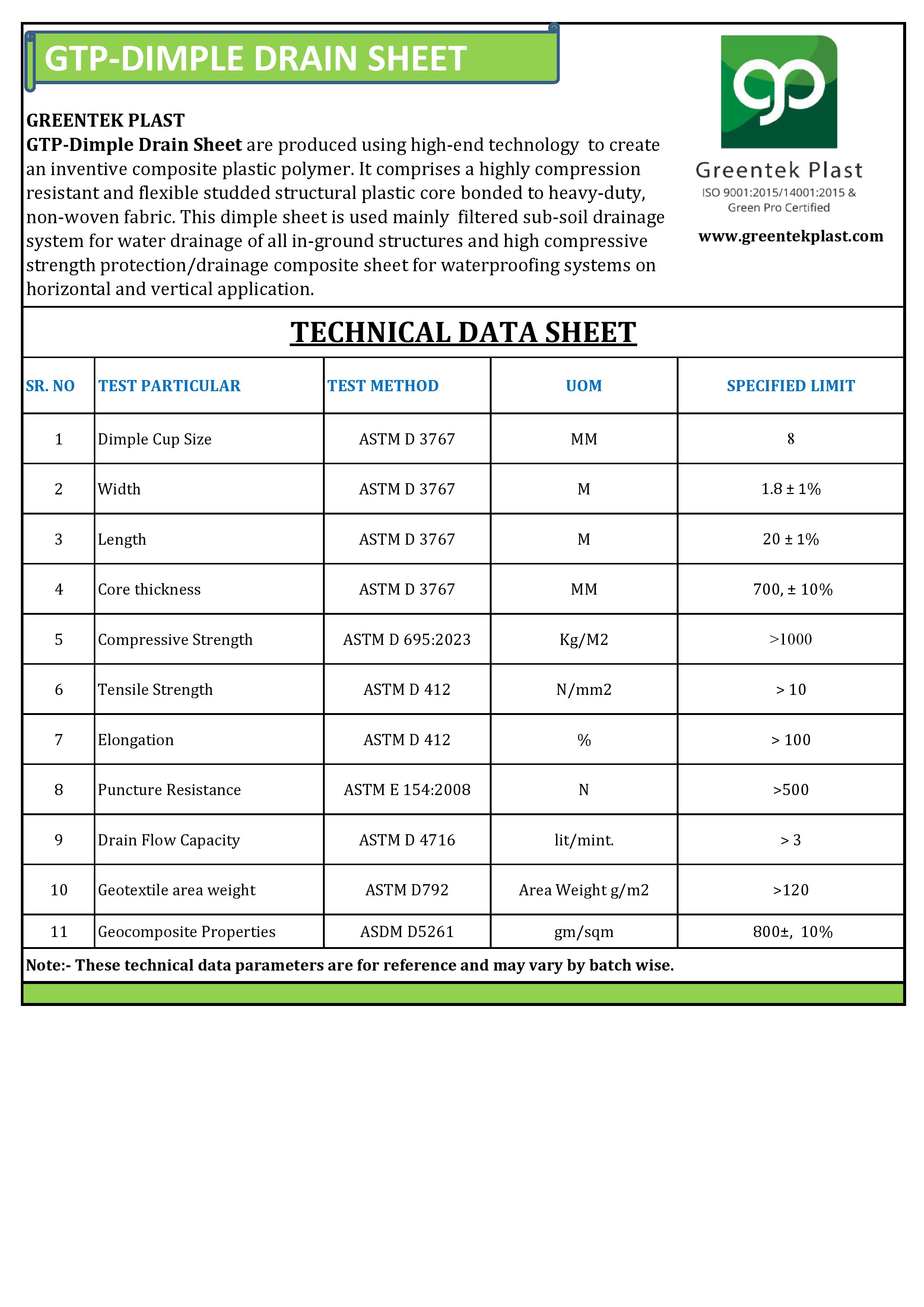 Dimple drain sheet is specifically designed for use with all waterproofing membrane systems as well as any torch-applied waterproofing membranes surface. It is an efficient, filtered sub-soil drainage system used for drainage of all underground ground structures. It comprises a highly compression resistant and flexible studded plastic dimple core bonded with non-woven filter fabric. The Dimpled drain plastic sheet provides effective protection for Waterproofed